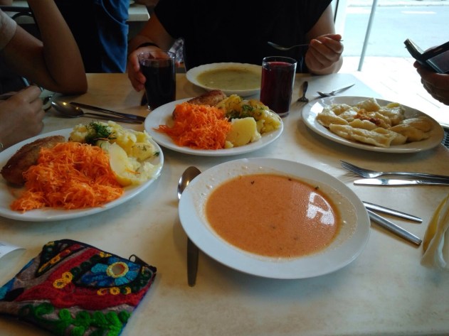 Haizea nos recomendó comer en los llamados bares de leche (Bar Mleczny) que son unos bares de la época del comunismo, donde hoy en día todavía se siguen utilizando y resulta muy económico (menú 13,50 zl, aproximadamente poco más de 3€) comer platos típicos polacos, como por ejemplo la sopa Zurek o los Pierogis (especie de raviolis con relleno dulce o salado).