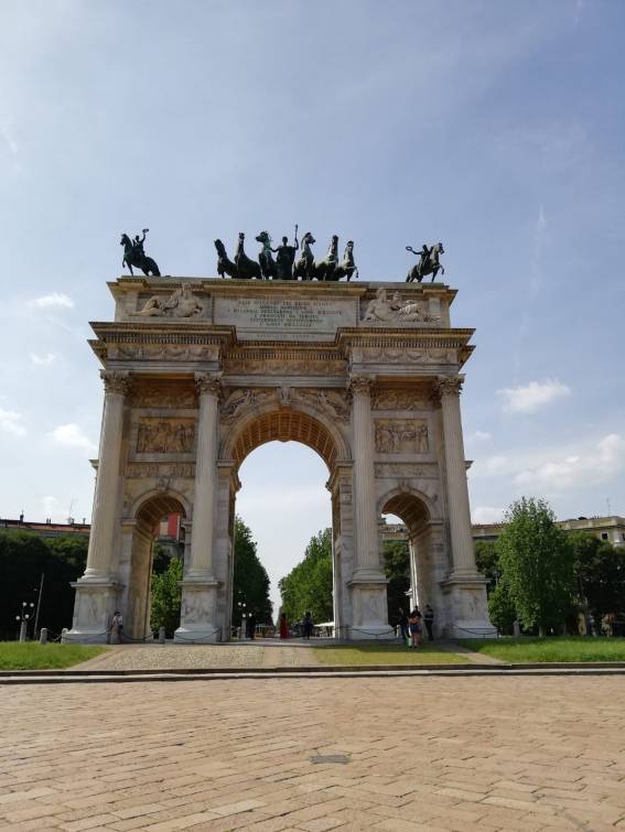 Fuera del castillo hay un puesto llamado “Minibar Castello” nosotros cogimos unos bocadillos riquísimos y estuvimos sentados en el césped debajo de los árboles. Después compramos unos helados y fuimos paseando por el Parque Sempione hasta llegar al Arco de la Paz.