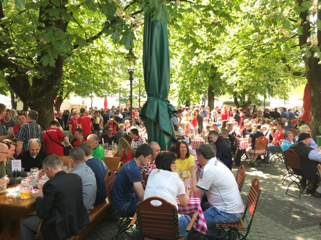 Viktualienmarkt es un mercado que merece muchísimo la pena. Puedes dar una vuelta, recorriendo los puestecitos dónde puedes encontrar puestos de verduras, quesos, fruta, zumos, flores… Si vienes en época primavera-verano, como fue nuestro caso, veras bastante ambiente en el biergarten (jardín de cerveza), unas terrazas dónde los muniquenses comparten mesa y cerveza. Además, puedes disfrutar de sus comidas para llevar mientras sigues paseando por el mercado.