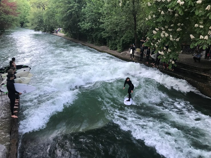 Además, no os podéis perderos a los surfistas… si si! En Múnich los puedes encontrar en el mismo parque siguiendo el río. Crearon una ola artificial que les permite surfear en el río.
