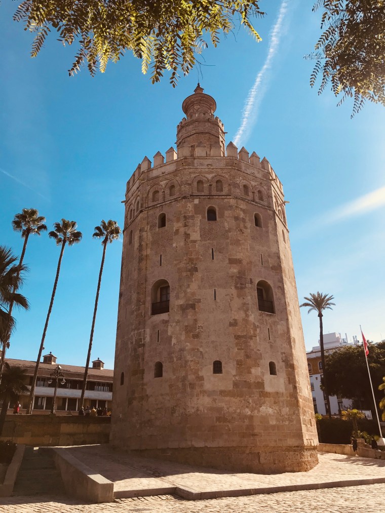 5.Fotografiar la Torre del Oro. Con este nombre, no esperes encontrar una «torre de oro» 😉 Se llama así por diferentes teorías: por el reflejo dorado de la torre en el Guadalquivir, porque albergaba oro y tesoros del Nuevo Mundo… Actualmente, la torre acoge al museo marítimo de la ciudad y un pequeño mirador, aunque las criticas tanto del museo como el mirador no son muy buenas.